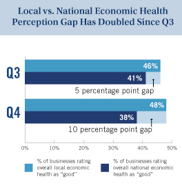 The gap between local and national economies is increasing. 38% of small business respondents reported that they were bullish on the national economy while 48% were bullish when asked about economic growth in their own backyard.
